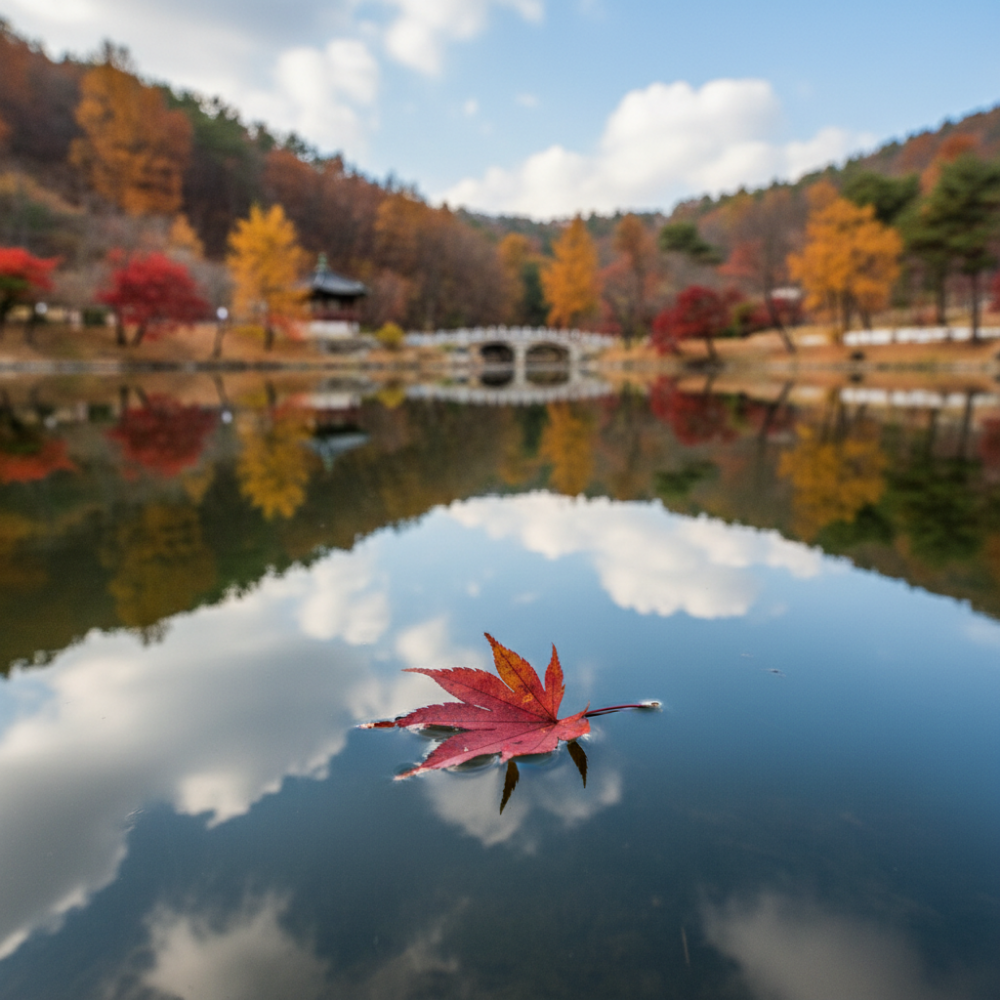 수면에 반사되는 단풍이 진짜 명화 같은 장소. 아침 시간대(빛이 가장 부드러울 때) 추천!