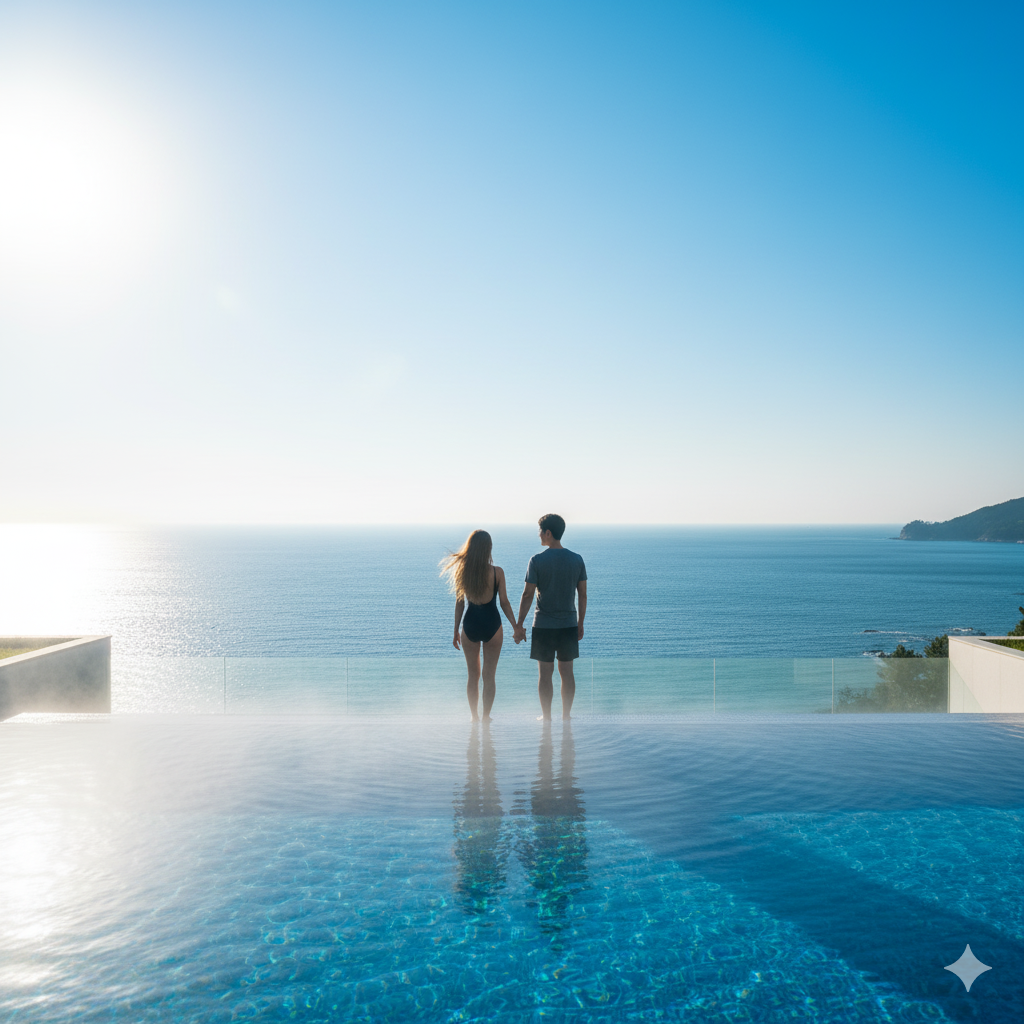 📢 [사진 꿀팁!] 가장 아름다운 사진은 해 질 녘, 즉 선셋 시간대입니다. 주황빛 노을이 풀장 물에 반사되는 순간을 놓치지 마세요!